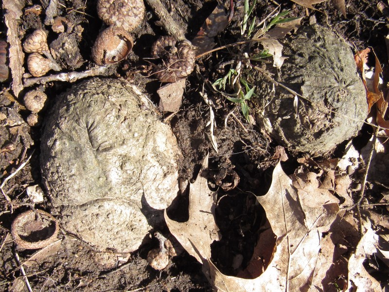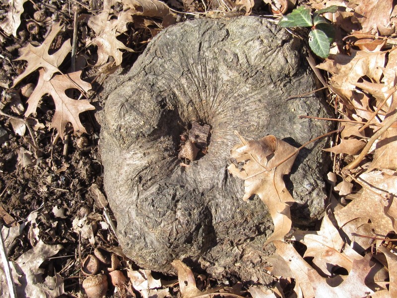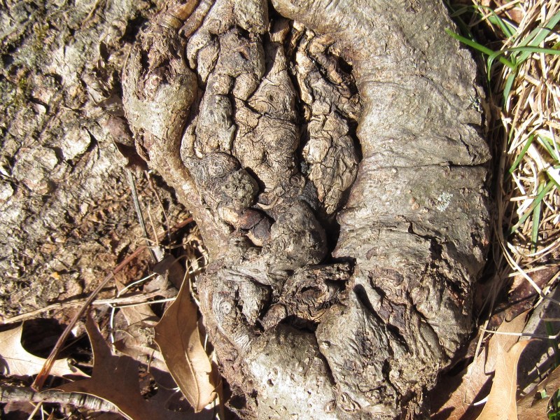Below are some ornamental burls in a young phase. At center, you can see how small these two are, by comparing them to the acorn caps. They make interesting little ornaments for the flower bed they push themselves up into.