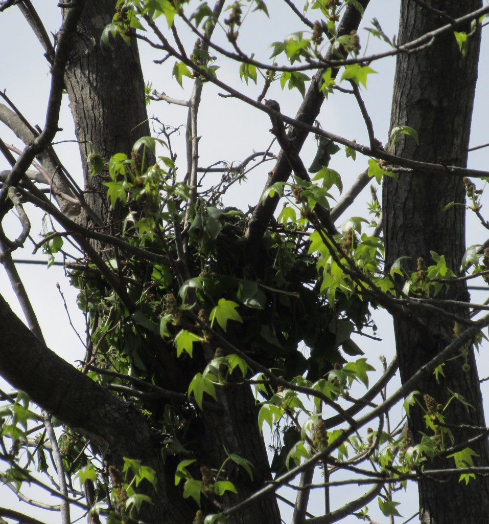 They were plain grey and tan, without notable spots that would identify them as a mourning dove’s, and I didn’t see the mockingbird Saturday. So I thought I’d lost him to a hawk. Today (Sunday) I saw the nest above in my sweetgum tree, even though the nest appears constructed with pear branches. Last year the Cooper’s hawks built an abortive nest in the pear. This year they seem to have made a better choice of location, but their preference of leaf type is interesting. Probably it’s because the sweetgum isn’t fully leafed out yet, or because its sap is too aromatic for their taste.