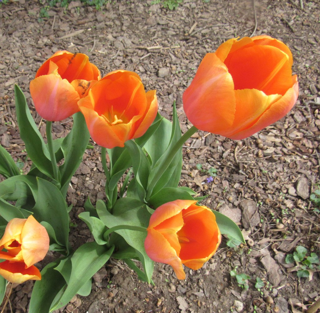 The last of the three types of tulips I planted last fall: Apricot Beauty, Dordogne, and this one, Salmon Impression. This one is really on fire, with lots of richness in its orange-shading-to-salmon coloration. And I’ve done well with tulips overall, despite the deer, after taking a few precautions.