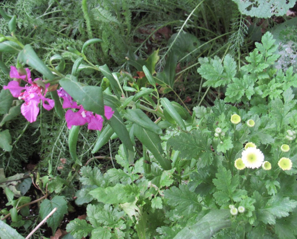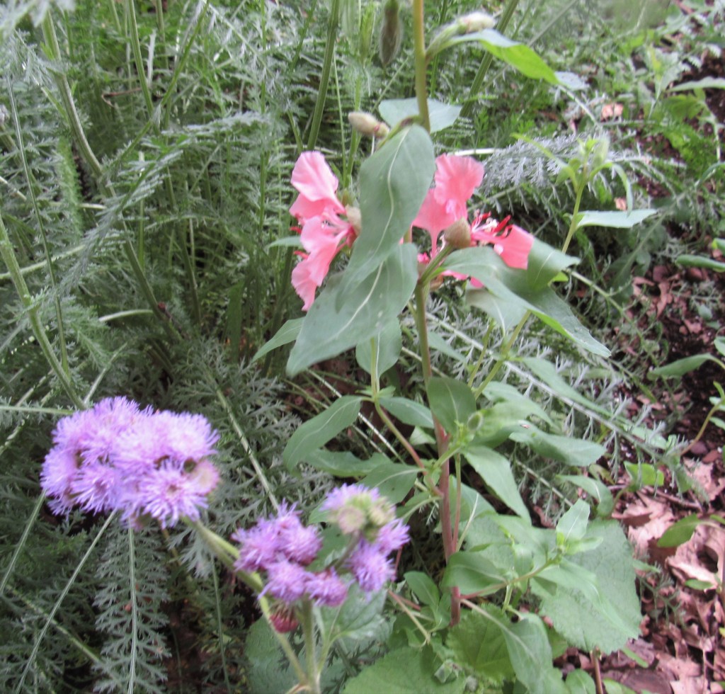 An annual I’m trying this year, Clarkia, related to fuchsias, that blooms in shades of pink. This variety I grew from seed is spacier in petal/sepal configuration than the cup-shaped flowers usually seen. The leaves and stems have a little of the succulent appearance of impatiens.