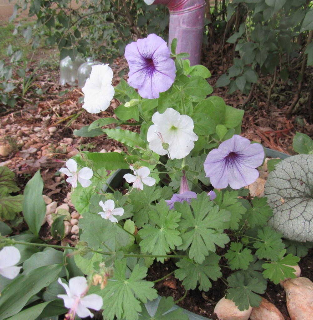 A nice effect of petunias and geraniums. Petunias grow most happily in pots, because slugs love them so much, petunias as bedding plants are likely to be tattered to death.