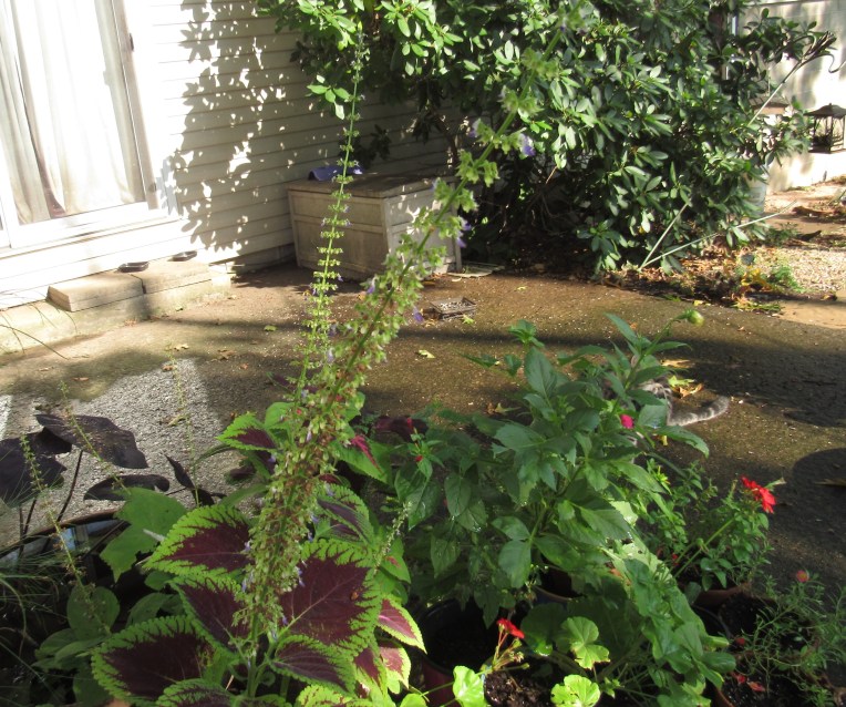 They say you should cut the flowers off your coleus. It’s true, they add a rangy, unkempt quality, but they are popular with bumble bees, and this year I’ve seen two hummingbirds, while last year, I saw only one—and it was the coleus flowers they were feeding on. These flower stalks by the bog tubs are about two feet long.
