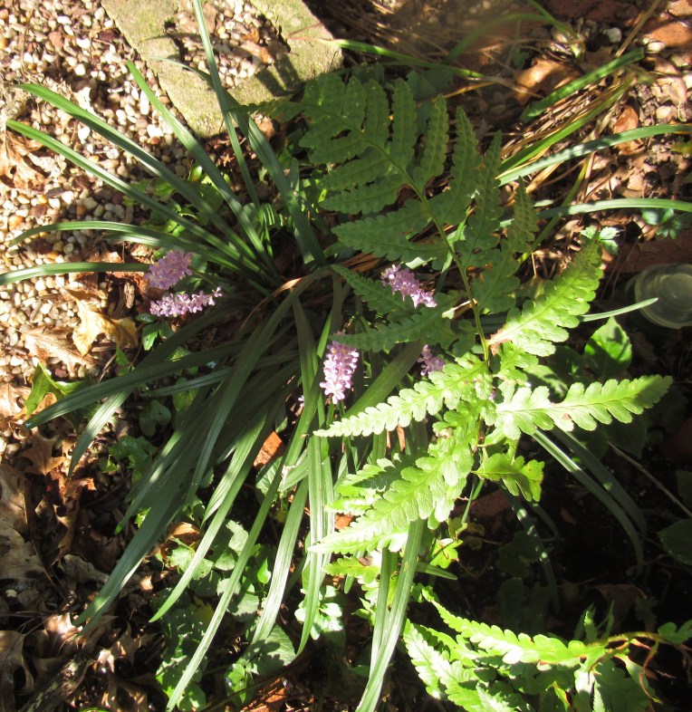 This photo composed itself nicely, with the bright sun and strong shadow, and the swirl of fern-leaf and liriope. The two plants were making a pretty woodland look, so I wanted to show a highlight of my garden at this time of year, when several things are finished.