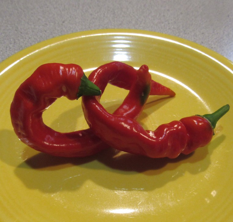 These are a kind of pepper called Jimmy Nardello. They aren’t chilies, but taste a lot like bell peppers. But they have the advantage, being thin, that the plants produce lots of them, and they ripen quickly. I like sweet peppers raw on a sandwich, and these Jimmys are abundant for sandwich peppers. Another good discovery.