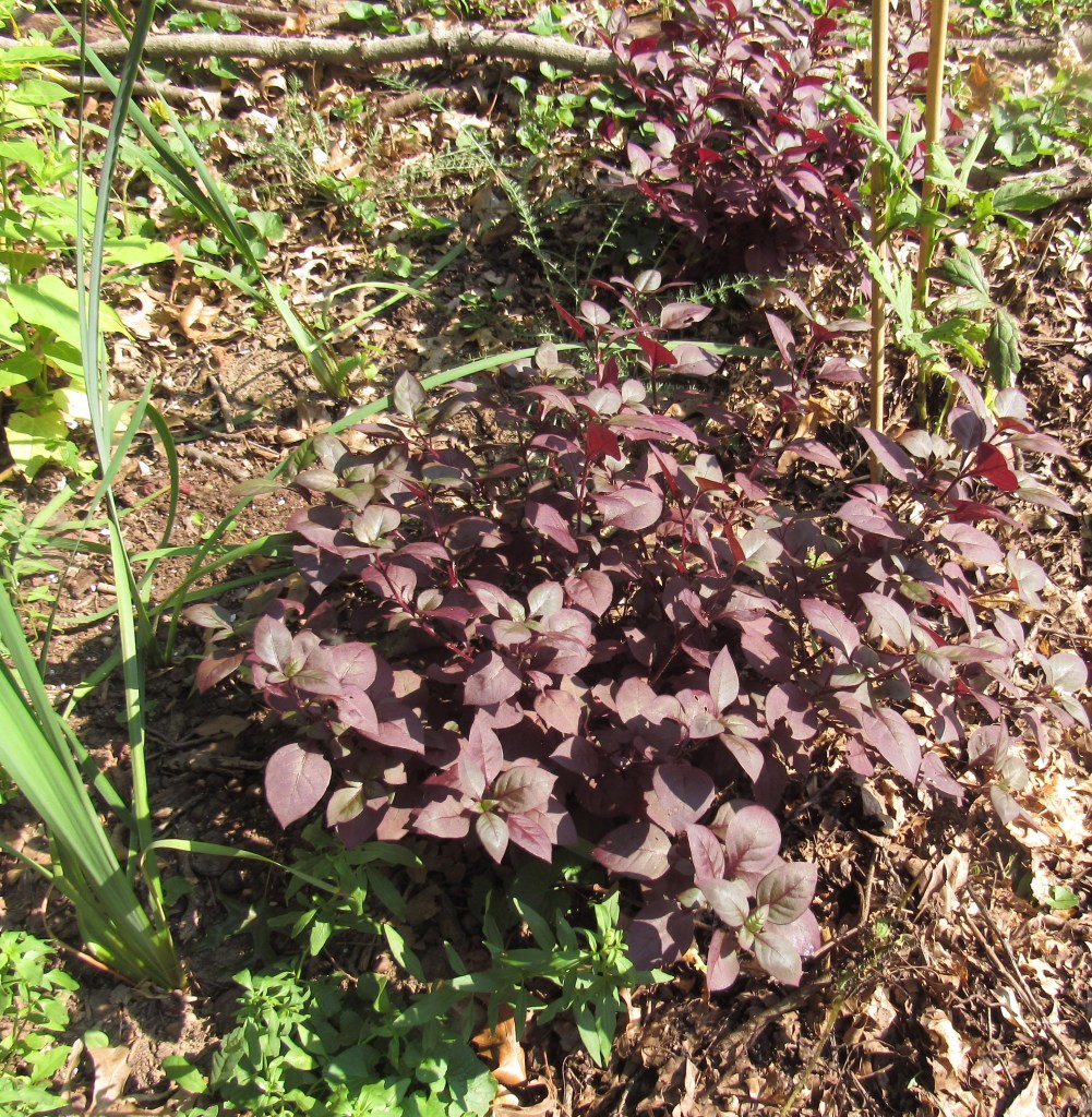 The alternanthera, that I mentioned also as a new discovery this year. So far, they’re super—beautiful foliage, even prettier with the new blue-green leaves against the older burgundy, than this picture shows. And they’ve grown to a small shrub size, much needed in this new planting area, where the other things have barely taken off. A rabbit, or a groundhog nibbled on them, but hasn’t done much harm to their looks.