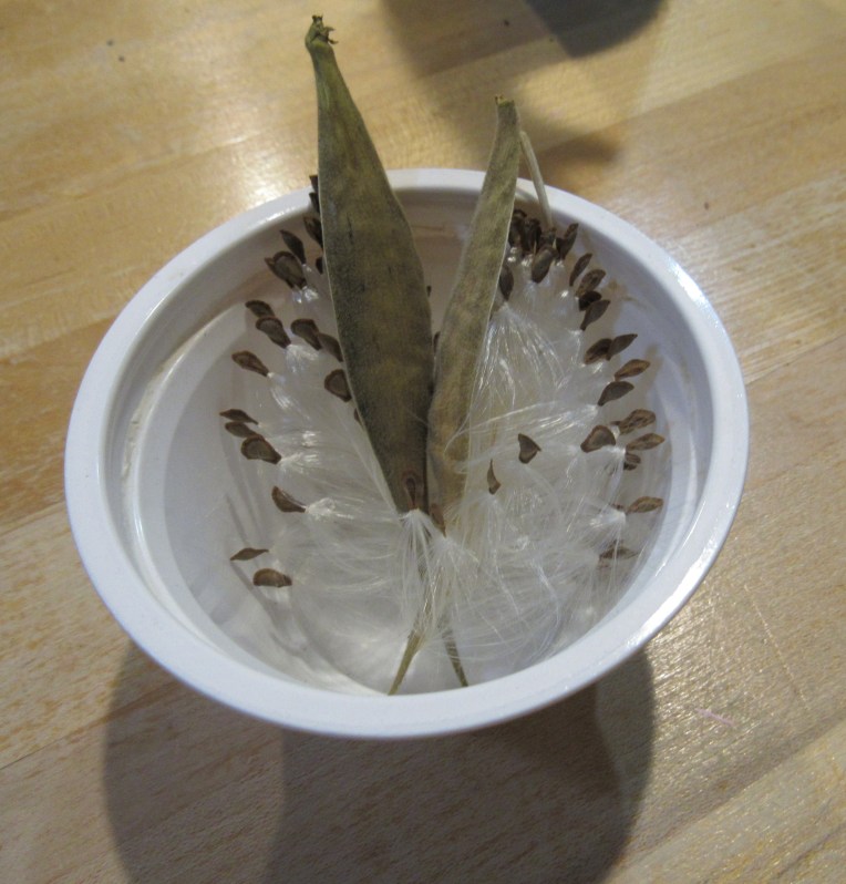 I collect a couple of pods, which as you can see gives more than enough seed. I put them in an open container in my garage. When they split naturally, which takes some months, the seeds will puff out from the expanding floss. The floss, once the pods have opened on their own timetable, pulls loose from the seed easily. That makes sense. The seed wants to root itself somewhere, not be carried by the wind forever.