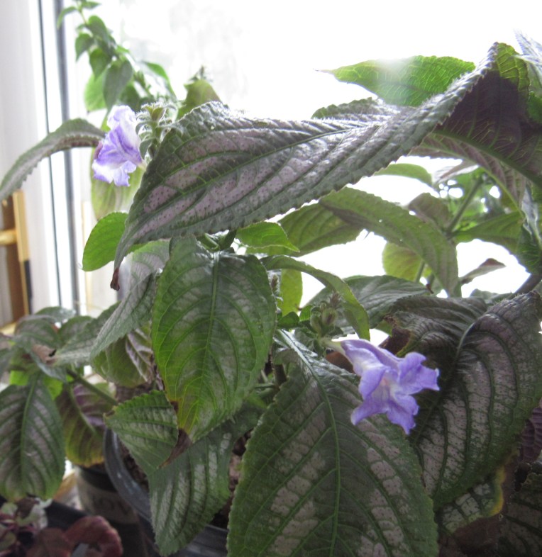 Strobilanthes dyeriana, the Persian Shield plant common in garden centers in the summer, is native to Myanmar. Some species of Strobilanthes are grown for their flowers, but Persian Shield is used for foliage. One of mine, that I brought to overwinter indoors, has put up dozens of flowerheads. Now some of the blooms are open, and as the photos show, they come out a pretty blue-purple, and with a shape like a penstemon flower, about an inch in length. (The two aren’t related; Strobilanthes is in the Acanthus family, and penstemon is in the plantain family.)