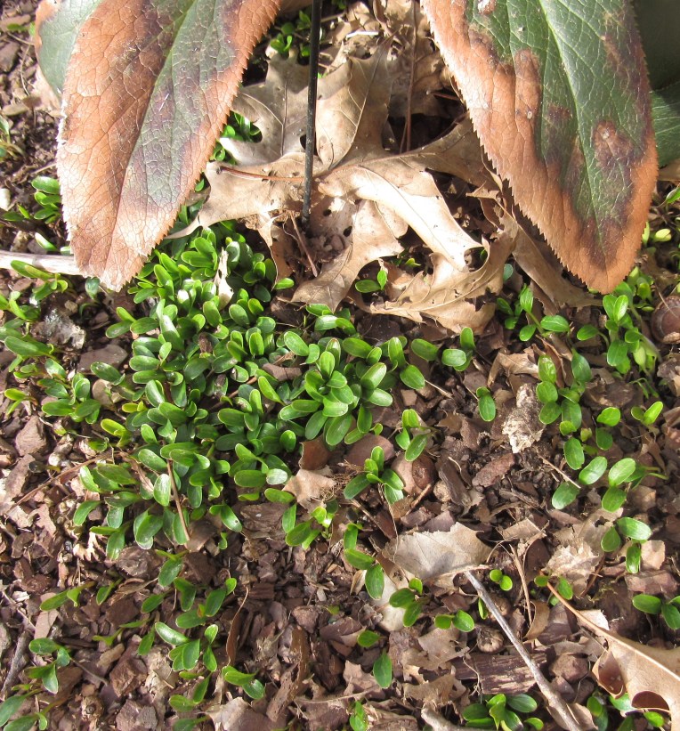 The third picture is of hellebore seedlings. Seemingly, every seed that dropped last year germinated. I have hundreds of them, and literally removed more than a hundred to start in pots. I don’t know what I’ll do with them all, but I can see lining paths with them. The deer don’t bother them, and they bloom in winter, so a little hellebore hedge ought to be a good idea.