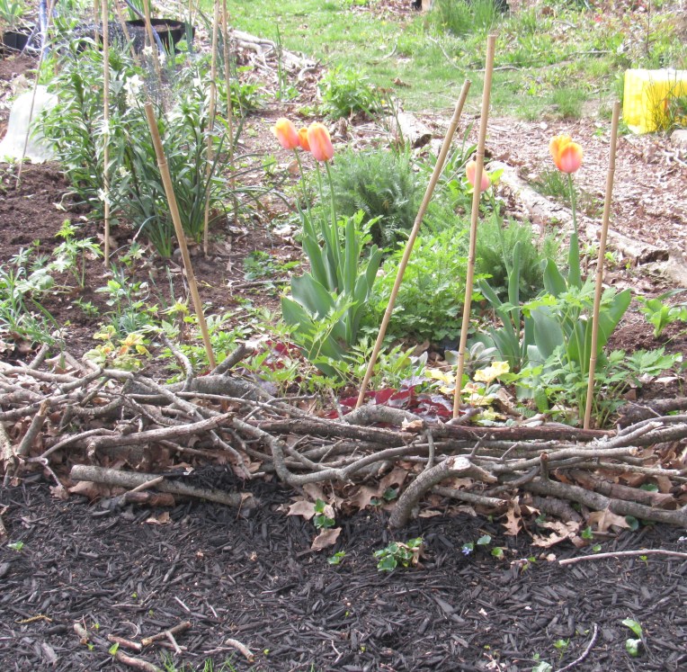 The stick fence defines this bed and makes a little habitat for garter snakes, salamanders, moles. I haven’t seen any garter snakes, but I hope I have one or two! This is a shade-to-sun bed, where I have heuchera at the edges, moving into some lupine and the only delphinium I have that came up from the seed I planted. And you can see the lilies with some deer baffling to keep them uneaten.