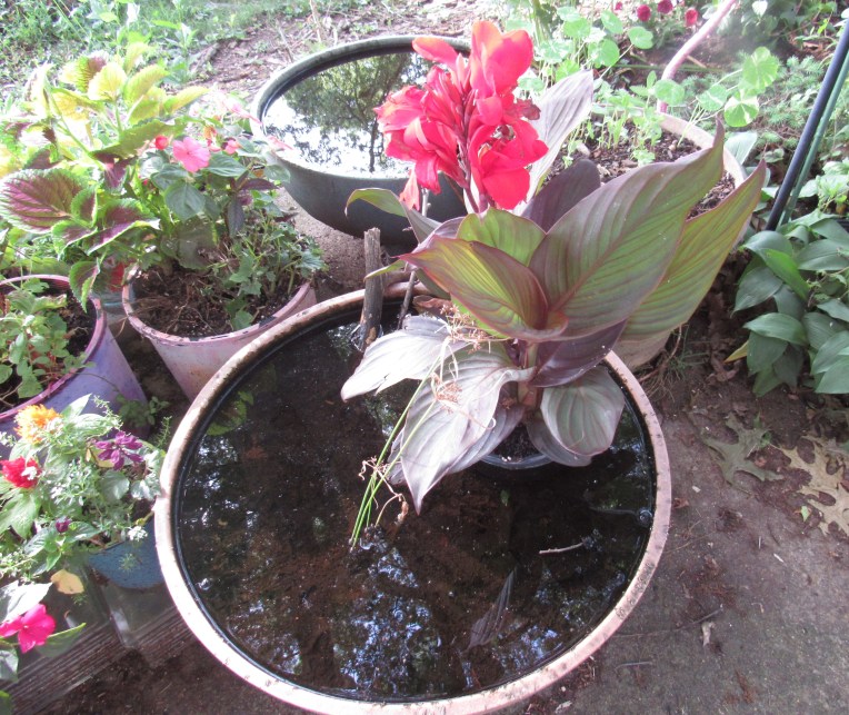 This is what I had in mind. I only found cannas in pots at our local Tractor Supply store. If you can get them this way, you can put the pot directly in your tub or pond. If all you can get are tubers, you’ll have to get them well started before putting them in water.