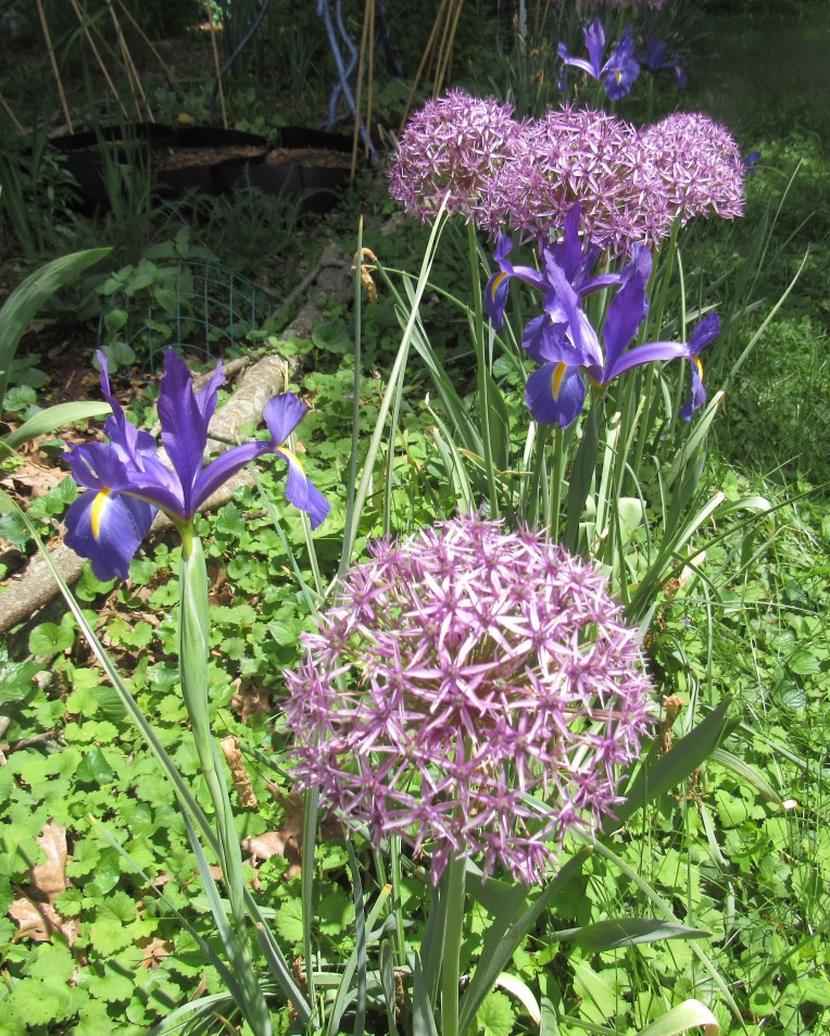 Last year, I mentioned the trouble with lonely alliums. This year, by serendipity, not plan, I discovered that this Globemaster type of allium blooms in sync with Dutch Iris. So that’s one answer.