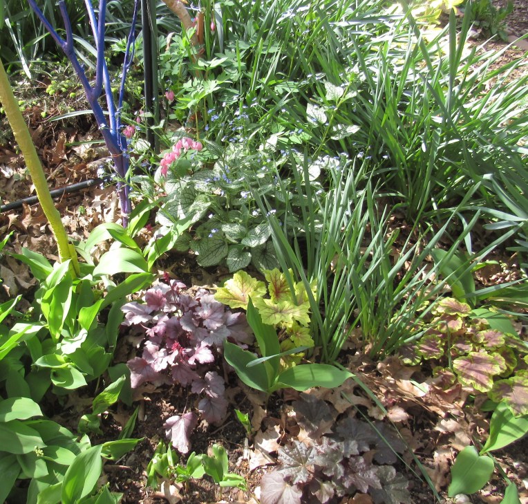An earlier view, with daffodil foliage still out, and some of the painted stick frame I’m growing Cobaea on.