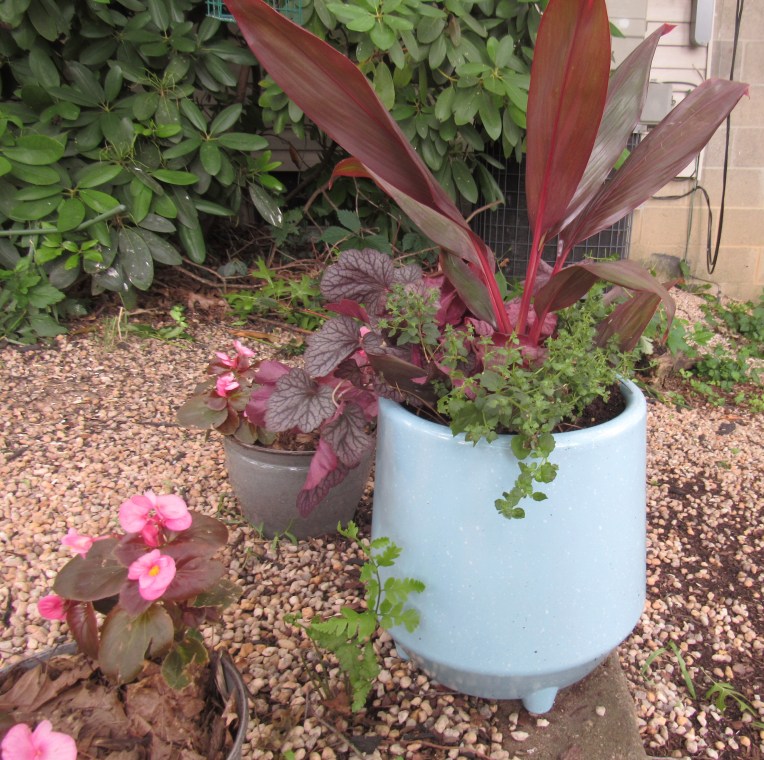 A mix of foliage plants and houseplants. I’ve seen houseplants used as summer garden plants, but I wasn’t planning to try it this year. I got started because I bought the cordyline at the upper right, thinking it was a canna. It has broad red/green leaves, while the only cordylines I knew of looked like ornamental grasses.