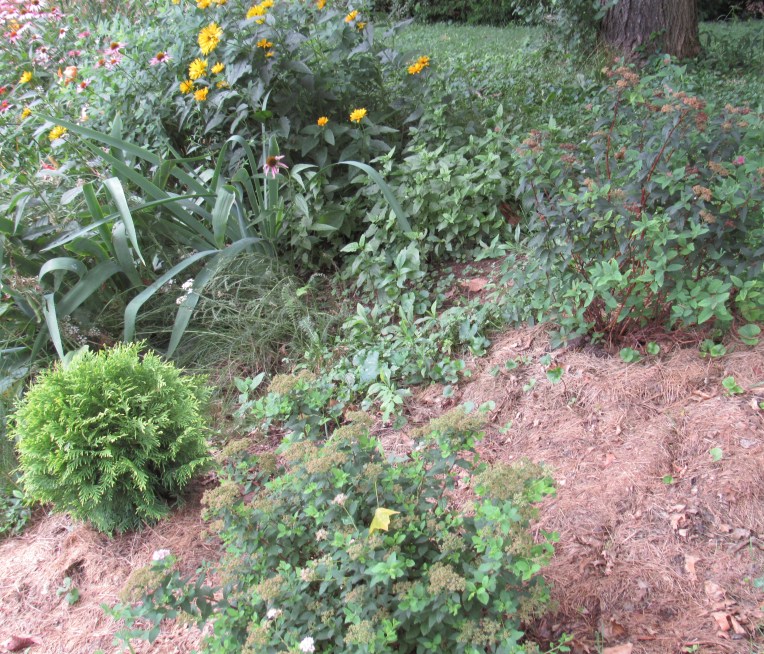 The edge of my driveway border. I’ve been expanding it out this year with shrubs. This area is under a maple and looks like heavy shade, but the corner gets sun in the mornings, and parts of the border get sun all day. Another factor is the right angle of the driveway and street that frame this area. The pavements reflect light, so nothing is severely shaded. I put in a pair of spirea, and as you can see, top right and bottom center, they’re adding lots of new growth. That’s what I want them to do, reach towards each other, and fill in the space. I’m going to add two Encore azaleas, and a bird’s nest blue spruce. My goal is to plant over my steep little bank, so I don’t have to mow there. I’m also planning to move those iris, that have never bloomed, and are so thickety they block other perennials.