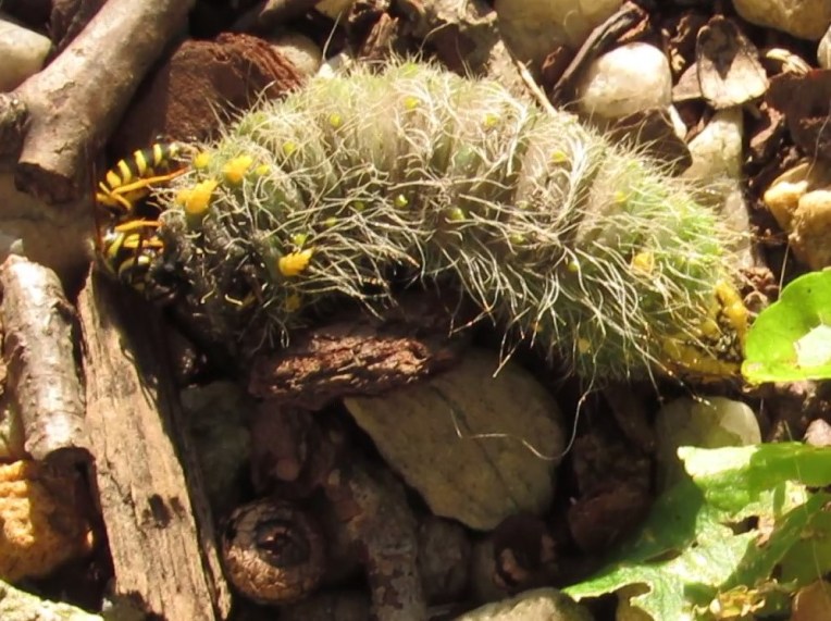 An Imperial Moth caterpillar that fell out of the oak. It isn’t dead, but the yellowjacket is eating its head, either because it was parasitized or injured, or from pure predation, if the caterpillar dropped to pupate. I’ve seen yellowjackets carry away entire green caterpillars, when only slightly larger than themselves. Another yellowjacket arrived, and they both took bites and flew away with them.