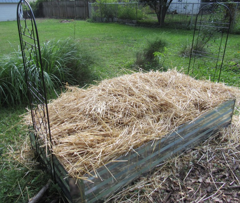 Next year’s vegetable bed, that I’m beginning this year. Assembling the box was easy; and it cost about $60 from Amazon. It measures 6 foot x 3 foot, by 1 foot high. A box this size would take dozens of bags of compost to fill, so I bought it this late summer, allowing me to keep topping it off with organic material (the bale of straw to start, then leaves and mower clippings, and homemade compost), that will decompose through the fall, winter, and early spring. The trellises are to support beans and peas. I had a so so year trying to grow veg in 2022, while learning a few more necessary facts about getting my edibles past the animals and the oak tree roots. Next year, I propose to have potatoes, corn, beans, and peas in this bed, and tomatoes, peppers, lettuce, and carrots in pots.