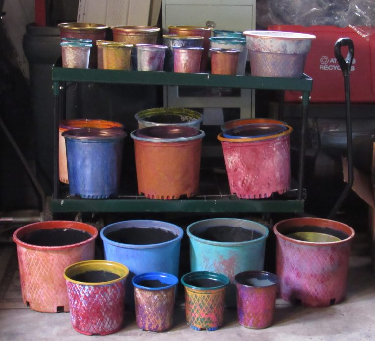A collection of nursery pots I painted (using outdoor-rated paints), that will be fun to cluster on the patio, along the paths, and here and there in the beds. The largest sizes I’ll use for vegetables. Next year, I plan to do tomatoes, peppers, lettuce, potatoes, kale, and gourds in pots, with stakes and deer netting. Every year I refine a little, though I haven’t got a good harvest yet. I have two-year-old strawberries that may produce, and Romanesco cauliflower that looks like it will keep growing into the winter.