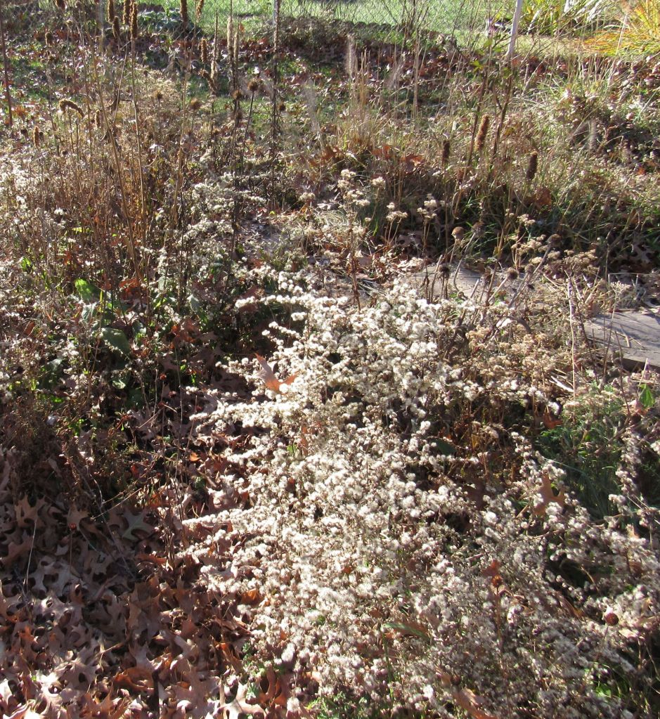 The two photos above show our native aster in seed, and looking like snow. It’s a love/hate plant for me because it sprouts up in droves in all my flower beds, and has to be weeded out everywhere, but it’s wonderful for pollinators, and really beautiful, both blooming and finished. The grass in the lower photo is pennisetum, which makes fabulous seedheads in fall, but is also a little problematic. The seeds are like burs and stick to your clothes tenaciously, plus the leaves are super sharp. With gloves and scissors, pennisetum sprouts have to be taken out of flower beds all the time.