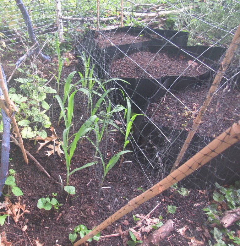 When I took this picture, I had maybe nine corn stalks on the way. Now I have five. I thought I had them well baffled in, but I looked out the window and a squirrel was uprooting them and eating the root bulb. I’ve got even more baffling around the remainder, and if I can save them from the wildlife, I may have enough plants to pollinate one another, and get an ear of sweet corn or two.