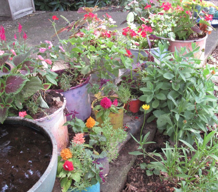 It’s the time of the season to trim down overgrown pot flowers, and space things out for better air circulation. I had a few getting too little water, and a few getting too much. All the trimmings from things that root easily, like impatiens and coleus, become filler plants for shade gaps, where bulb foliage has died back.