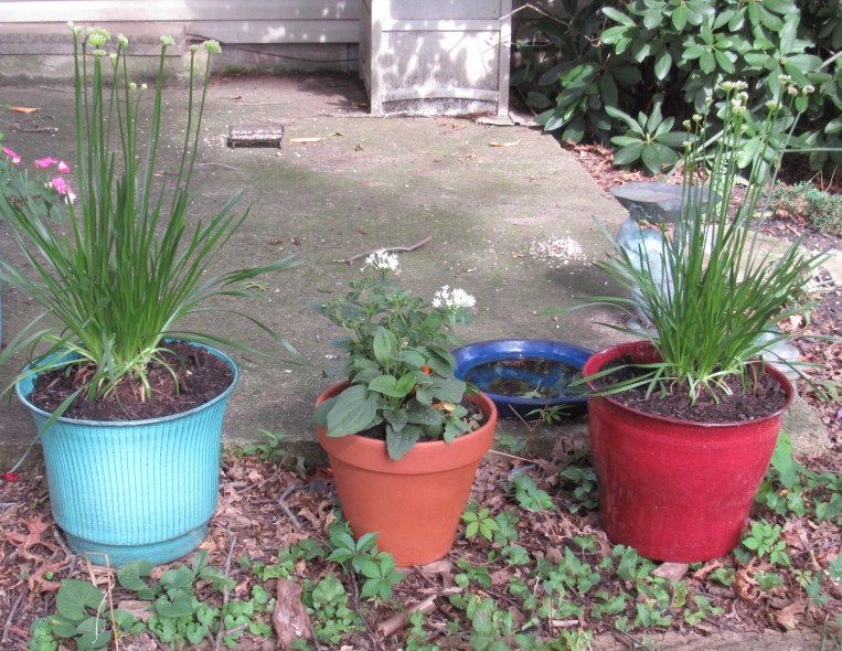 Here’s another case where a single plant in a container can be all that’s needed. These are late blooming alliums (flanking a black-eyed susan and some white pentas). And the deer will truly leave onion-family plants alone.