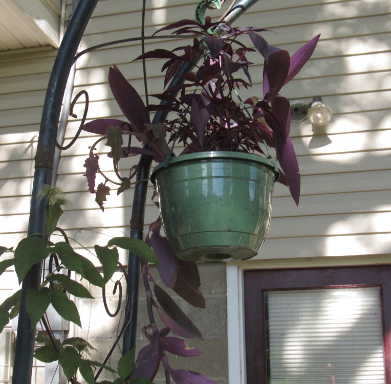 Putting a combo of plants with red/purple leaves in a pot makes another nice effect. Above are tradescantia, sweet potato vine, and purple velvet vine.