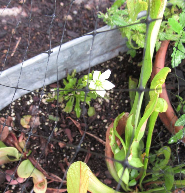 A venus flytrap I bought at Walmart, just to add another item to my pitcher plant tub. But it stuck up a flower head, and this is what the flower looks like.