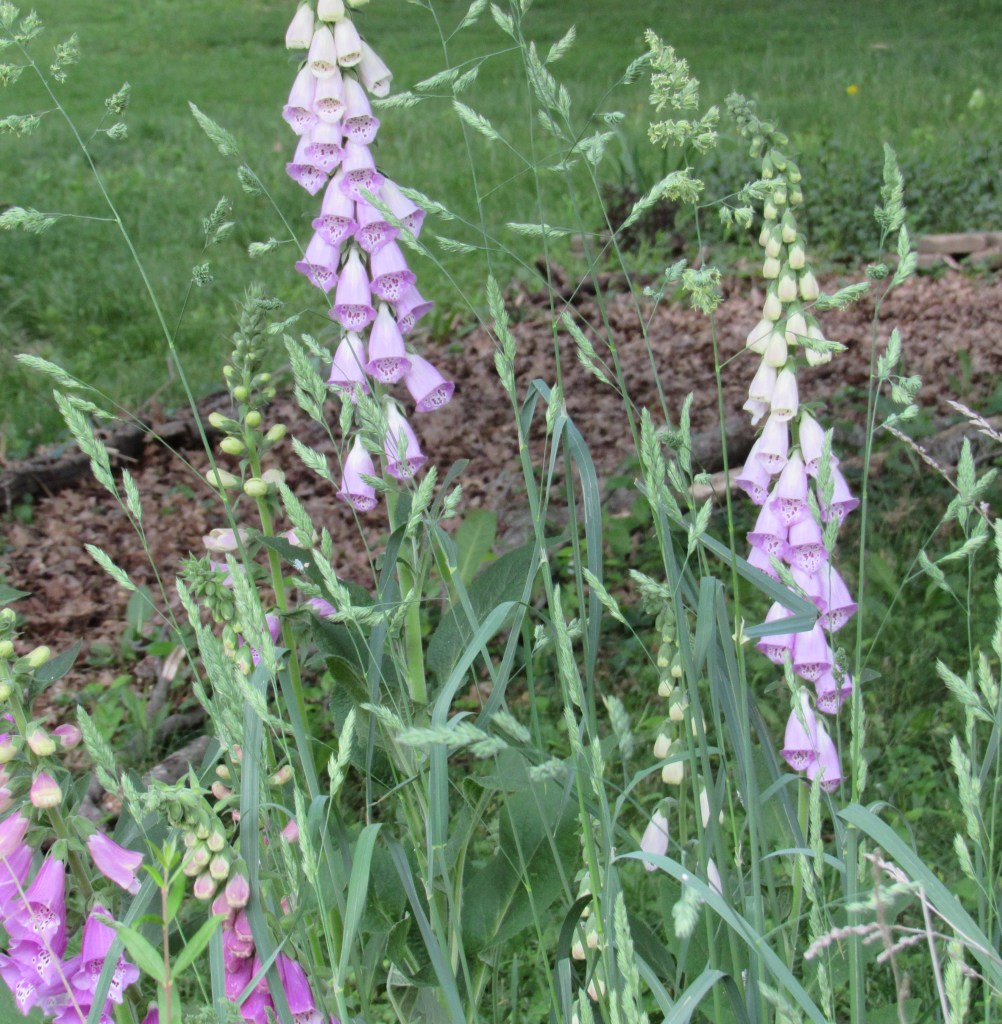 We had a good wind this week, and a number of my five-foot-tall foxgloves got bent over. The flowers are still opening, and the bees are still pollinating, so I don’t want these inside; also, of course, I don’t want my cats bothering them. The flowerheads are finishing their lifespans in this bucket of water, with the half-lid to keep creatures from trying to drink. The seeds should fall into the bed, so I can redistribute my new plants next spring.