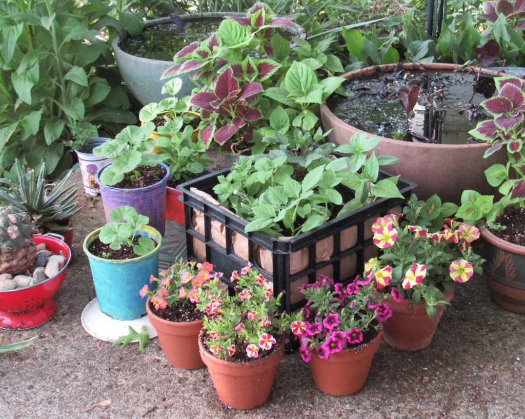 This year’s pots. The blue and purple ones are throwaway nursery pots, decorated with craft paint. It’s a way to keep plastic out of the environment, and I recommend painting pots as a waiting-for-warm-weather March or April hobby, and as a usual practice these days. Not just collecting pretty ceramic and terra cotta, but building your stock with repurposed plastic. Think…if as few as a hundred people did six pots each, that would be 600 pieces of plastic out of landfills, roadsides, waterways..