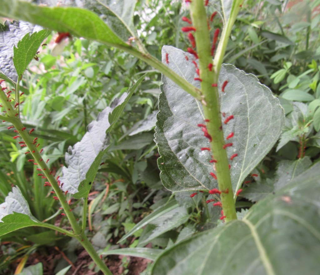 The strange red aphids above have been all over my heliopsis. As you can see, they attach themselves to the stems in a regimented way, and sort of float (on a too-tiny-to-see mouthpart, I presume). What I do about aphids, is let them be. I’ve seen yellowjackets, as well as ladybug larvae, eat them. These days, when all of nature is precious, our rule should be, Lose the Plant, Save the Planet. In fact, most afflicted plants won’t die from bugs or funguses…and if a plant can’t survive in your garden, you can find plenty of others that will.