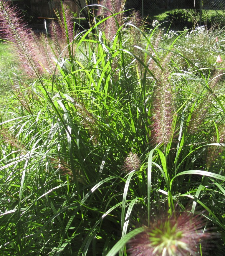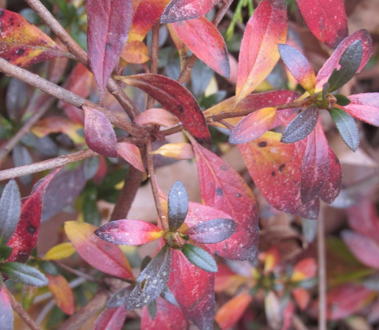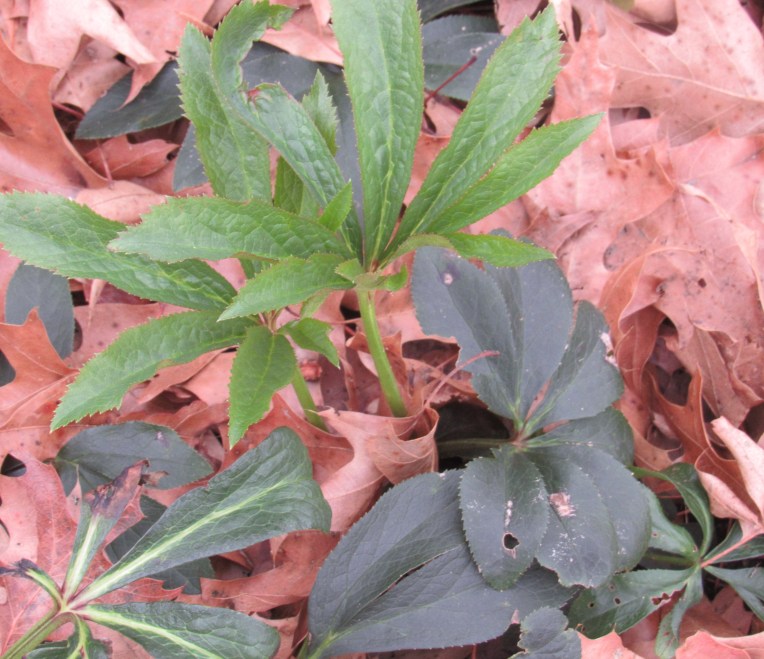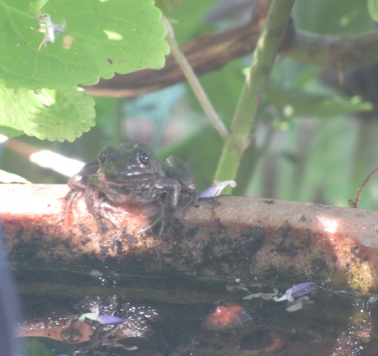 This area, coming downhill along a three-foot drop from the highest part of the yard to the lowest, has not been satisfactory. It’s all under oak shade, nicely dappled, but the roots allow almost nothing to grow naturally. The principle for planting under trees is build up, don’t dig down. One way is to construct three-quarter boxes from logs or stones, angled to the slope, and fill them with soil, then add a small shrub or perennial, and let it root in. I’ve made some pleasant areas with mostly shade plants, but as you can see middle left, a sunny section too, of sedum and hen and chicks.
