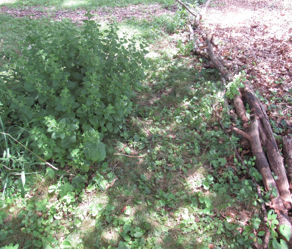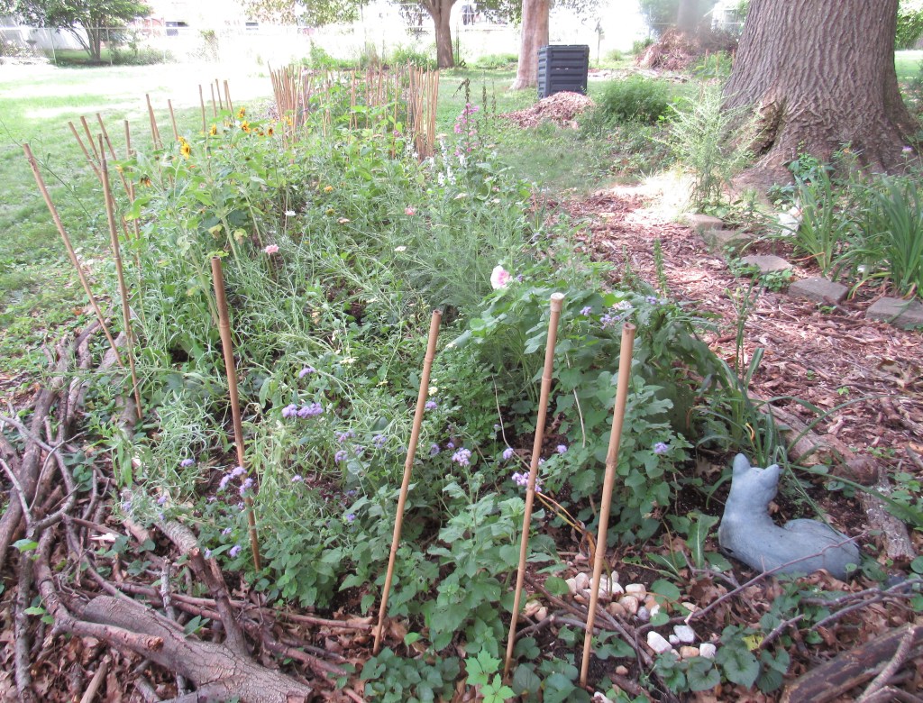This Is my backyard border, a little collapsed at the center where daffodil leaves used to be, keeping me from planting densely there in the spring. The bamboo stakes are deer-discouragers. The mulched path on the right, I filled in with free wood chips and twigs that form naturally at the bottom of my brush heap. Windfalls from my trees are the edging. Mature logs taken from the heap can be light as paper, reduced to a crumbly texture by the fungi that feed on them. As edging, logs and sticks look nice; they also create microclimates and mini-habitats. So far, I have never seen a reptile or amphibian in my yard, but I’ve added water, stones, and rotting wood, all of which are are important to toads and turtles, etc.