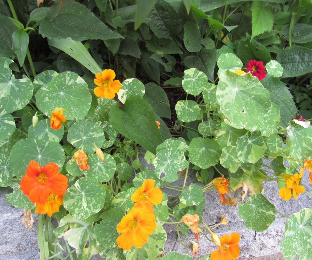 The Alaska nasturtiums blooming, with all their color range.