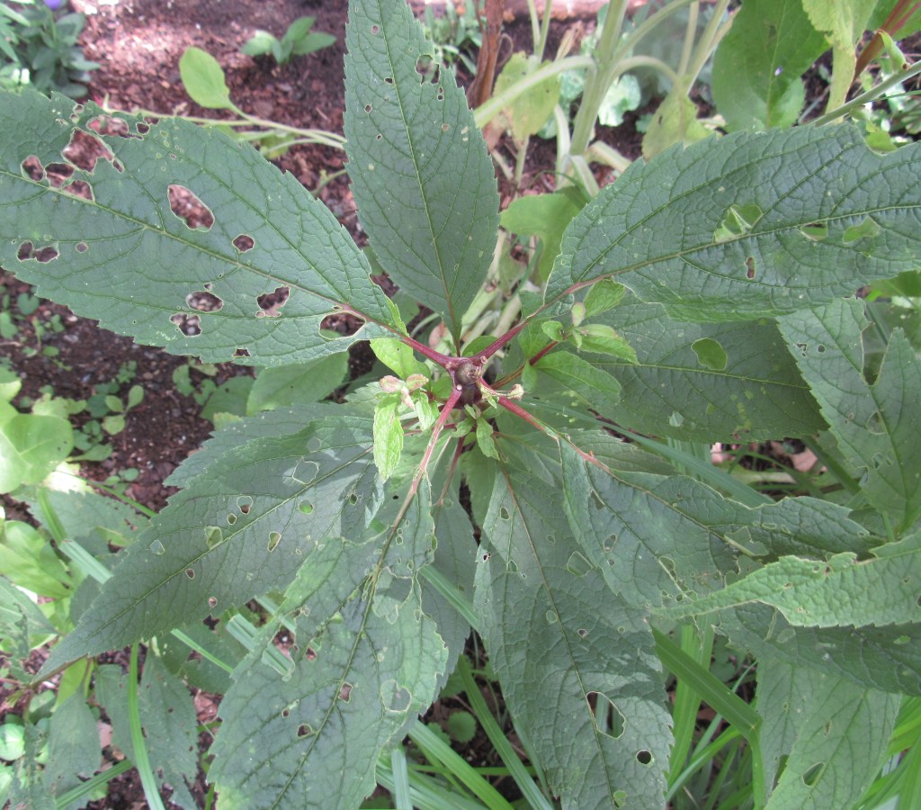 Joe Pye weed is a North American native, and its flowers are loved by butterflies. This leaf damage is a good sign that some insects, aside from Japanese beetles, are being fed. The Joe Pye is not a noted host for butterfly larvae, but feeds the adults and attracts them, so that if you have Paw Paw, a host for the Zebra swallowtail, or milkweed, for Monarchs, or pipevines, which have a swallowtail of their own, etc., your yard can help keep butterflies from disappearing—a genuine possibility these days.
