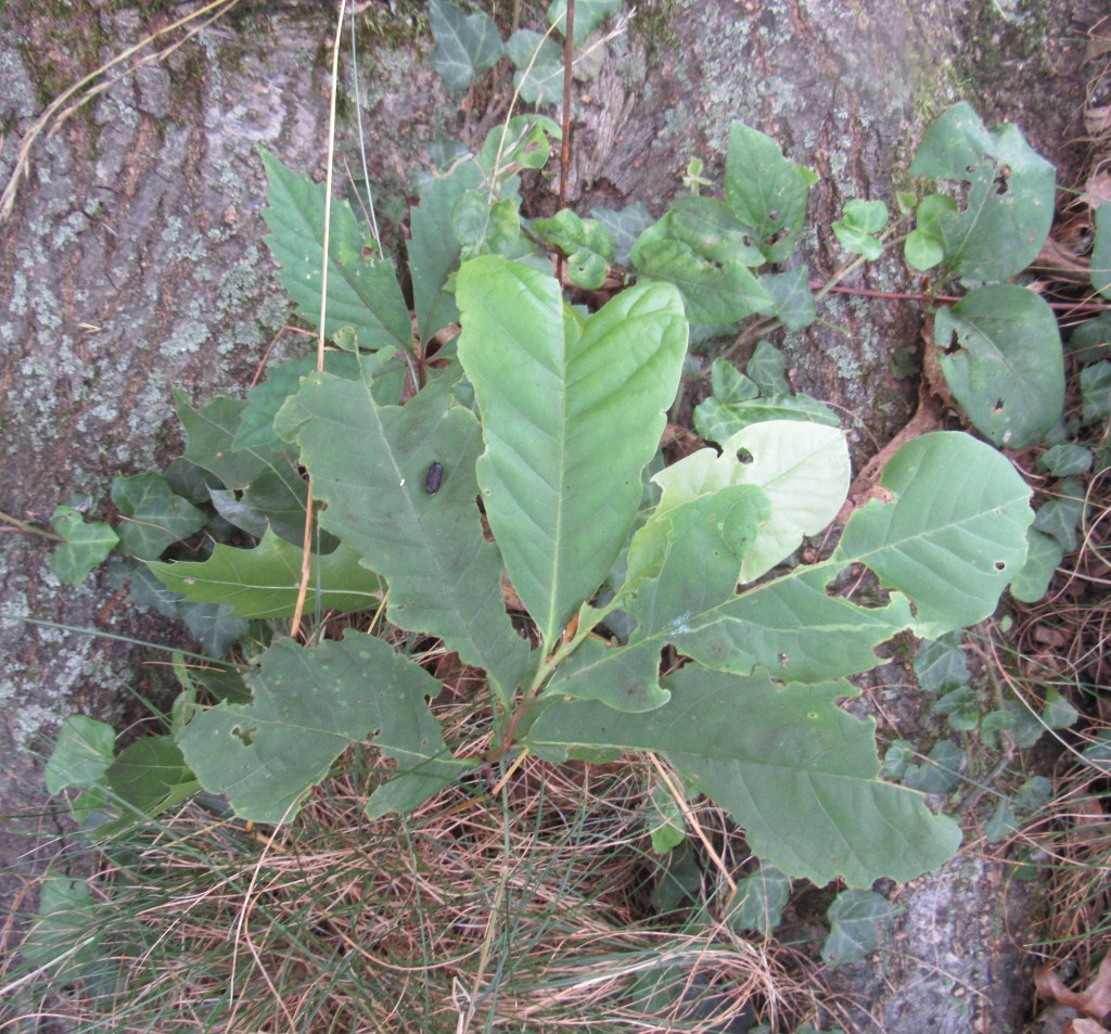 This one, that I thought was a birch, and then thought was a beech, I’m beginning to think is a hornbeam. Its characteristics don’t really fit either of the others. It’s a great favorite with everything that feeds on leaves. The skeletonization is caused by Japanese beetles. The larvae of Japanese beetles thrive in sunny expanses of lawn, while their best predator, fellow foreigner the European Starling, like most warm-blooded creatures, likes to forage (grub) in the shade. Starlings have done good work for me in keeping this particular pest under control, so I don’t worry about them…even though they are awfully noisy birds.