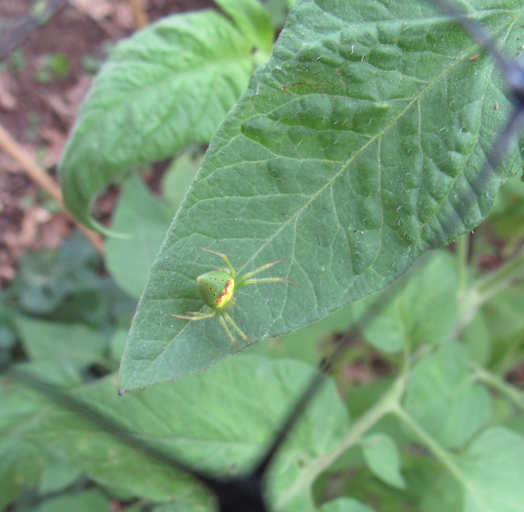 A cute-as-can-be little spider on my Brandywine tomato. It looks like he’s trying to pass himself off as a tiny tomato hornworm. Maybe this spider preys on the braconid wasps that prey on the hornworm.